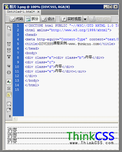 第一步:在文件打开情况下选择DW的“拆分”或“代码”都可,我们这里以选择“拆分”为实例