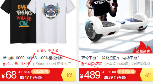 各大电商平台,个人商城也好,各大产品买卖也好,都会用原价格和优惠后价格形成对比,让用户产生购买下单欲望。通常会布局显示出原价格与优惠后价格,而原价格使用中划线(价格中间用一道横线删除线)。