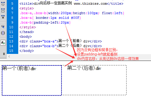要对右移div本身设置padding-left,有一个前提条件,这个div没有边框和div本身背景与div外背景色没有区别,这样借助padding-left内左边距,实现div没有右移,内容右移,看上去就像div右移的一样效果。