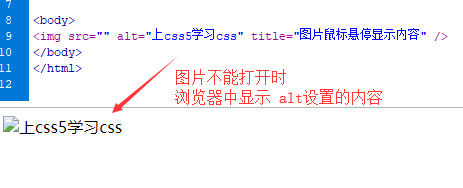 当图片不能显示时候,就显示一个“叉”同时显示alt的内容,这也是描述图片是什么内容的一个属性,针对SEO优化设置,让搜索引擎认识这张图片是什么内容。