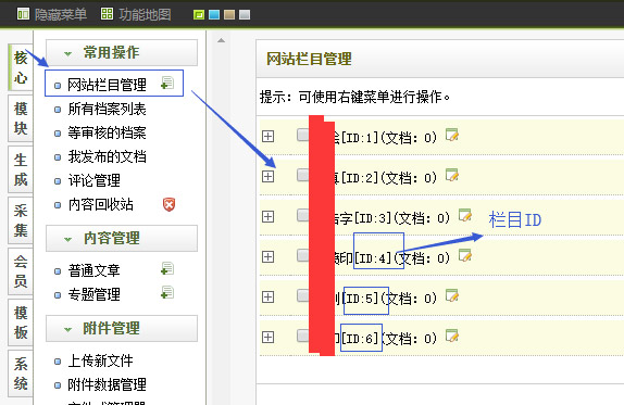 1、登陆DEDECMS后台——核心——网站栏目管理