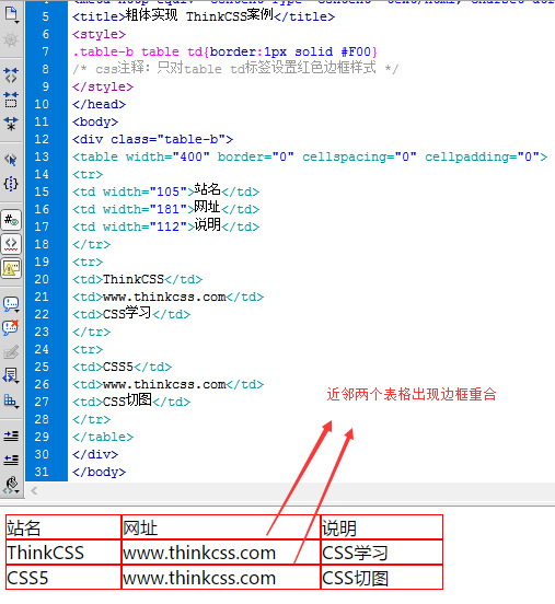 如上第二点,只对表格对象td设置单一边框样式,中间部分td与td标签之间就会出现双边框现象。