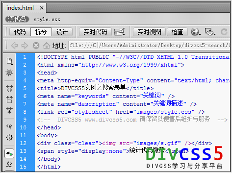 使用DW软件打开项目“HTML8-search”文件夹内的“index.html”