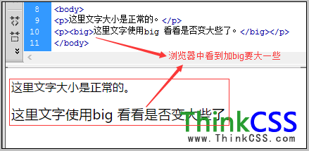 <big>目的在于让字体增加一号大,但有时CSS预先设置,而有的浏览器又不兼容big,所以不推荐使用。